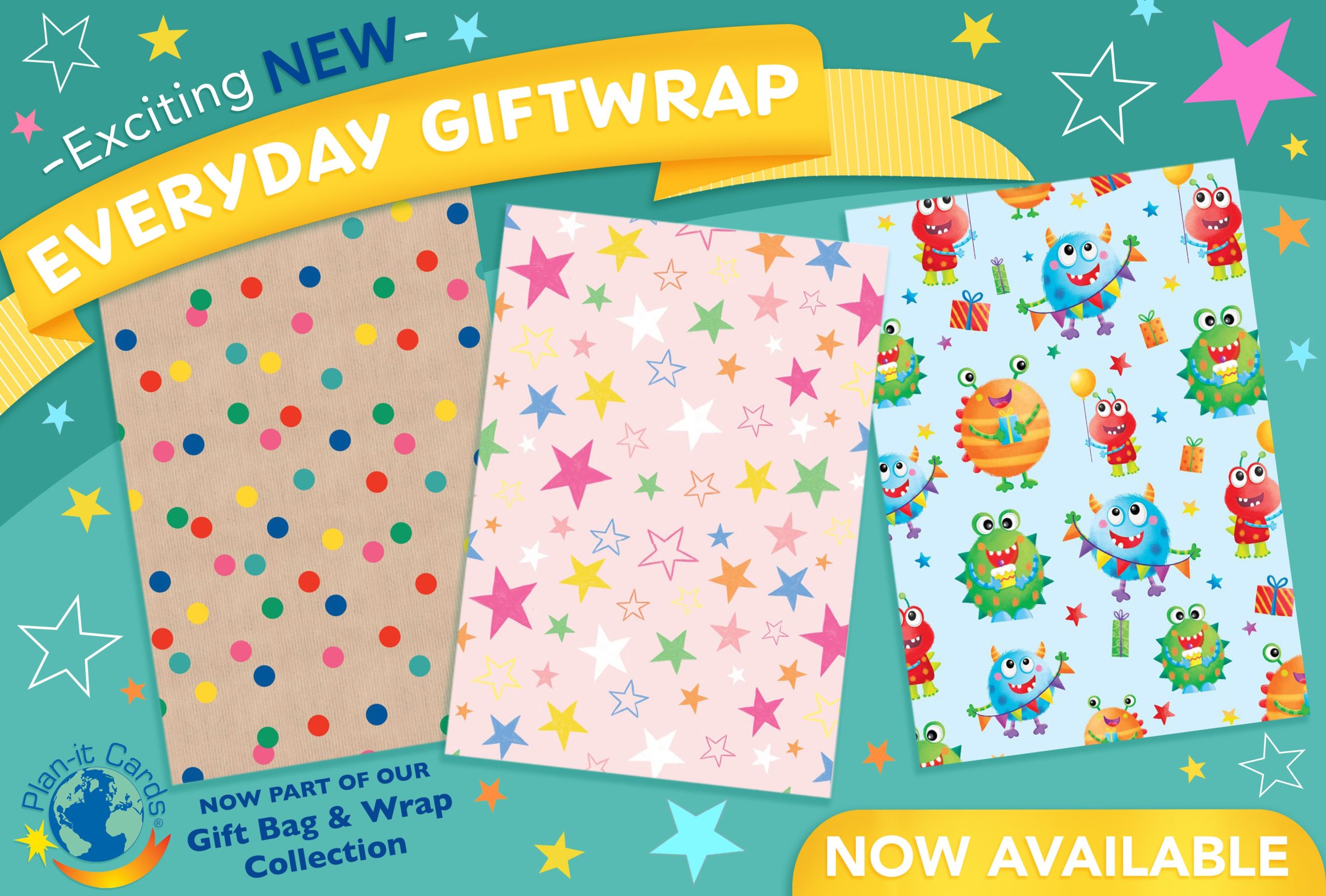 We pleased to be adding 3 new and exciting Everyday gift wrap designs to the Plan-it Cards Gift Bag & Wrap Collection.